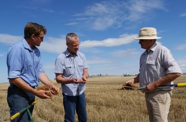 SoilCQuest Director and Founder Mick Wettenhall, Professor Peter McGee of the University of Sydney and SoilCQuest Founder and Chair Guy Webb, near Forbes, NSW